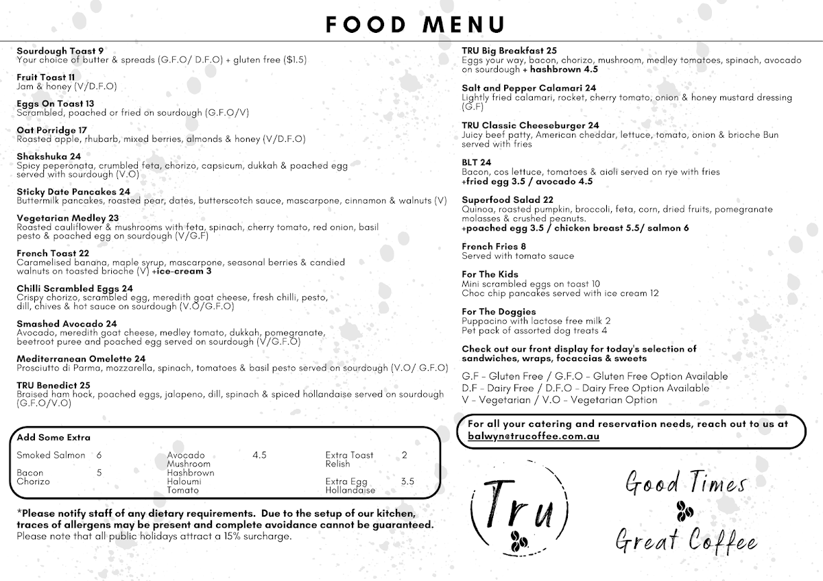The menu is a tribute to all-day breakfast and lunch, featuring a delightful range of options. Start your day with scrambled eggs on sourdough or indulge in the hearty Tru BIG Breakfast. For something sweeter, the chocolate chip pancakes are a must-try, especially when paired with a scoop of ice cream.